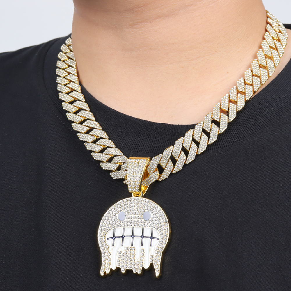Le collier est orné d'un grand pendentif au motif de crâne souriant et stylisé (souvent appelé "Ghost Face" ou similaire dans le style hip-hop).