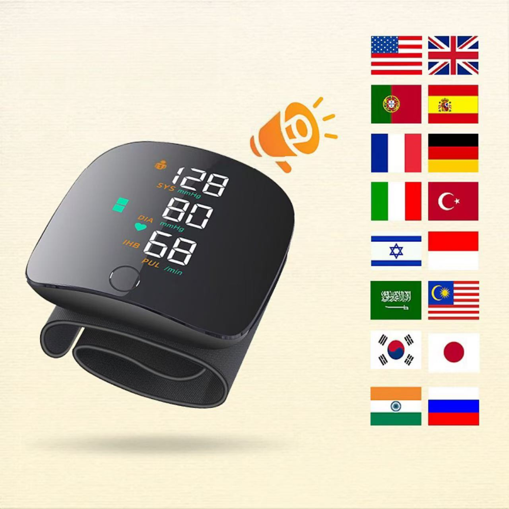 L'icône de haut-parleur indique une fonction d'annonce vocale des résultats de la mesure. Cette option est particulièrement utile pour les utilisateurs qui préfèrent une confirmation audio ou qui ont des difficultés à lire l'écran. Elle rend la mesure encore plus accessible et rassurante, en plus d'une pochette de rangement rigide pour le transport.
